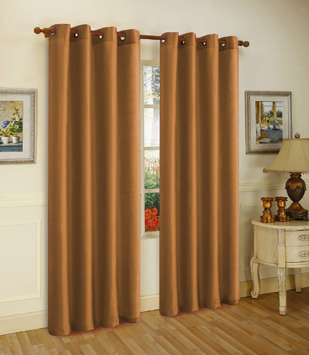 Faux silk panel with 8 bronze grommets will enhance the look of your home. Picture shows two, package contains one. Made with 100% Polyester, Machine wash cold on gently cycle. Do not bleach, dry on low setting, Cool touch up iron if desired, hang dry is also recommended. Color: LATTE. Size: 55" x 84".