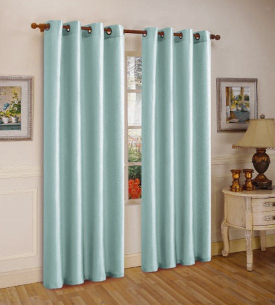 Faux silk panel with 8 bronze grommets will enhance the look of your home. Picture shows two, package contains one. Made with 100% Polyester, Machine wash cold on gently cycle. Do not bleach, dry on low setting, Cool touch up iron if desired, hang dry is also recommended. Color: Light blue. Size: 55" x 84".