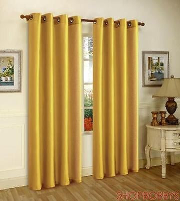 Faux silk panel with 8 bronze grommets will enhance the look of your home. Picture shows two, package contains one. Made with 100% Polyester, Machine wash cold on gently cycle. Do not bleach, dry on low setting, Cool touch up iron if desired, hang dry is also recommended. Color: Mustard-yellow. Size: 55" x 84".