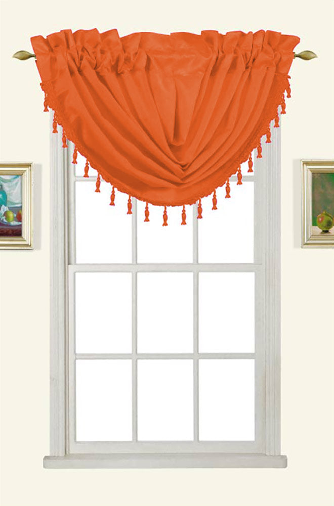 Melanie faux silk rod pocket waterfall valance with beaded tassels. The valance has beaded hanging tassels. This valance will look great with matching melanie faux silk panels. 100% Polyester, Machine wash warm with mild soap. Delicate cycle, tumble dry low. Cool touch up iron if desired. Size: 58" x 37". Color: Terracotta.