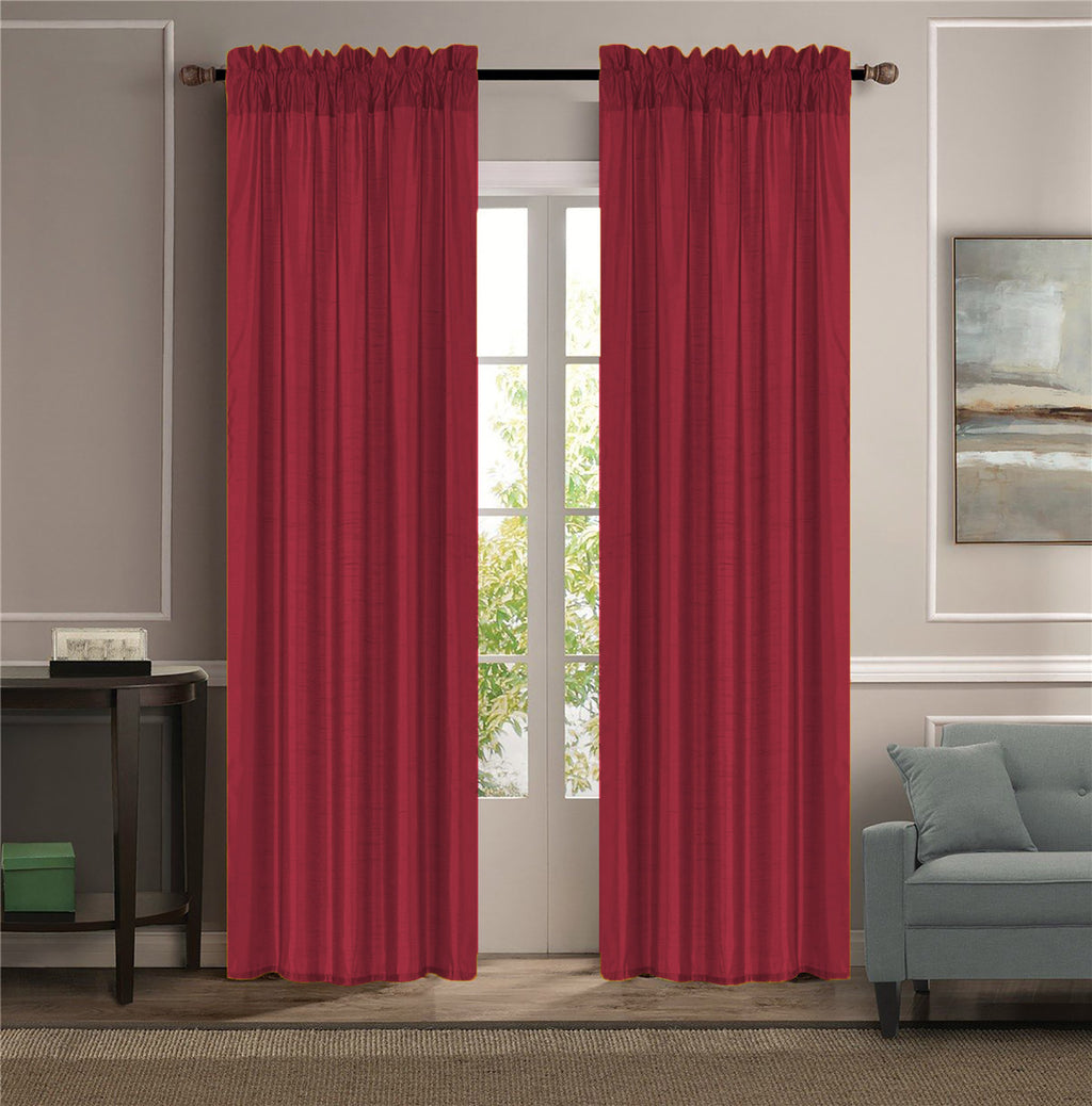 Transform any room in your home with the Melanie Faux Silk Rod-Pocket window Panel. These panels are perfect for you to add style and a decorative flair to your area. Its fabric has a beautiful sheen to it, mix that with the vibrant color will make these an eye-catcher! Faux silk is the perfect for you to create a textured surface that feels like silk. The bright hues compliment your existing decor while liven up your area and bringing personality. These panels will be your new favorite item in your house! The Melanie Faux Silk Rod pocket panel will filter the light from passing through all day. Made of 100% polyester, the fibers are strong and won't wear down as quickly while being flexible and resistant to wrinkles and shrinking. Polyester is also hydrophobic so the panels will dry quickly when wet. Add style, privacy and the right amount of light to enter your home. MATERIAL: 100% Polyester. CARE: Machine wash in cold water at gentle cycle, using mild detergent, Tumble dry low. Do not bleach. Wash separately. Do not use fabric softener. CONTENTS: Picture shows 2 Panels, Package contains 1. COLOR: Burgundy. DIMENSIONS: 55x84 Inches.