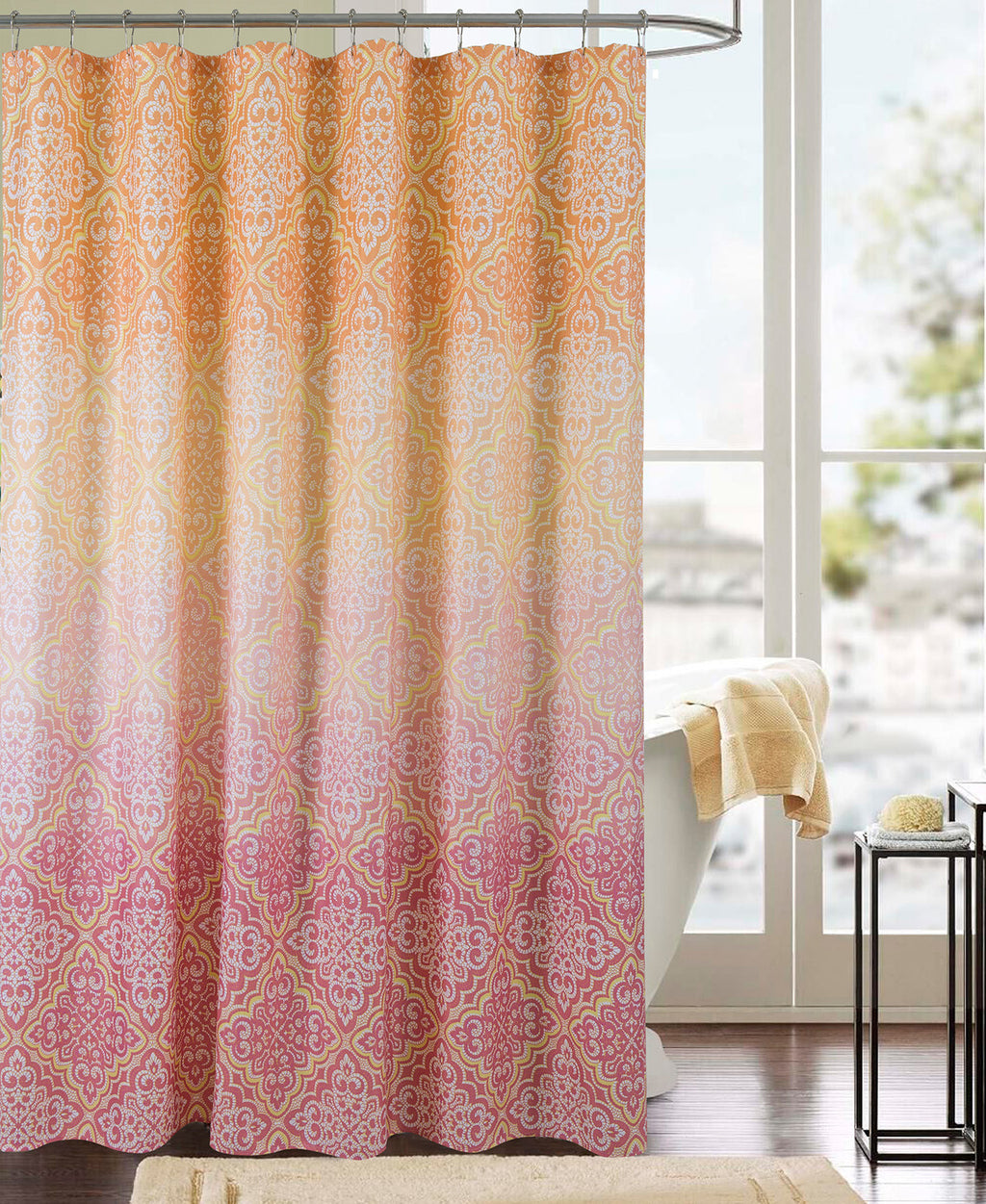 Instantly refresh and update the appearance of your bathroom with the Mia 13-Piece Printed Shower Curtain Set With Hooks. This beautiful shower curtain set features a bold, printed Moroccan inspired quatrefoil-damask design in white, yellow and pink on a colorful semi sheer background. The unique design is sure to beautify any bathroom space and add a modern touch. This shower curtain set will match well with various color schemes of towels, rugs, bathroom mats and any other bathroom accessories. Made of 100% polyester, this shower curtain set is resistant to wrinkles and shrinking. Polyester is breathable which means that it’s not prone to mold and mildew. The set comes with 12 beaded roller hooks for an elegant touch. When it’s time to spruce up your new shower curtain, save time and pop it into the washing machine as the curtain set is machine washable. COLOR: Orange-Pink. DIMENSIONS: 70x72 Inches. SET INCLUDES: One Shower Curtain and 12 Beaded Roller Hooks.