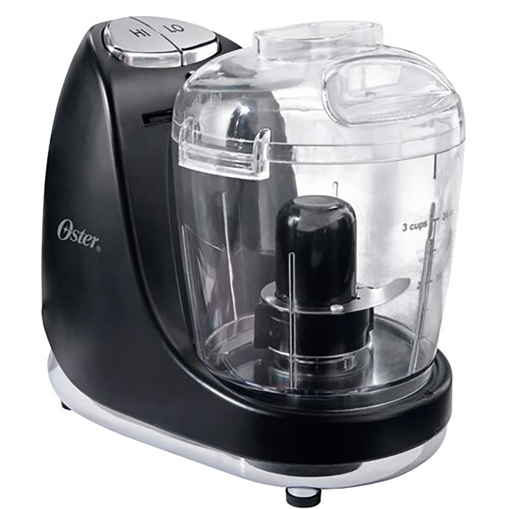 Whether you want to chop, puree, emulsify or whisk, the Oster 3-Cup Chopper does it for you in minutes. This chopper has a 3-cup-capacity work bowl that is the perfect size for small tasks, high and low speeds to handle all your daily chopping needs. With a sharp S-shaped stainless-steel blade that chops, slices, dices, purees, you use this vegetable chopper for anything from chopping vegetables for a homemade pizza to pureeing garbanzo beans and garlic for a hummus spread. The drizzle hole on the lid makes adding water or oil while chopping a breeze and makes sure that the oil or water is evenly spread and there is even a whisk attachment for making your own homemade whipped cream. The cord tucks neatly away enabling compact storage. This 3-Cup Oster Chopper will make an attractive yet functional addition to your kitchen. COLOR: Black. DIMENSIONS: 7.9x9.1x5.6 Inches. CAPACITY: 3 Cups.
