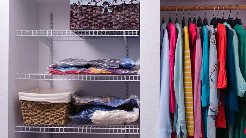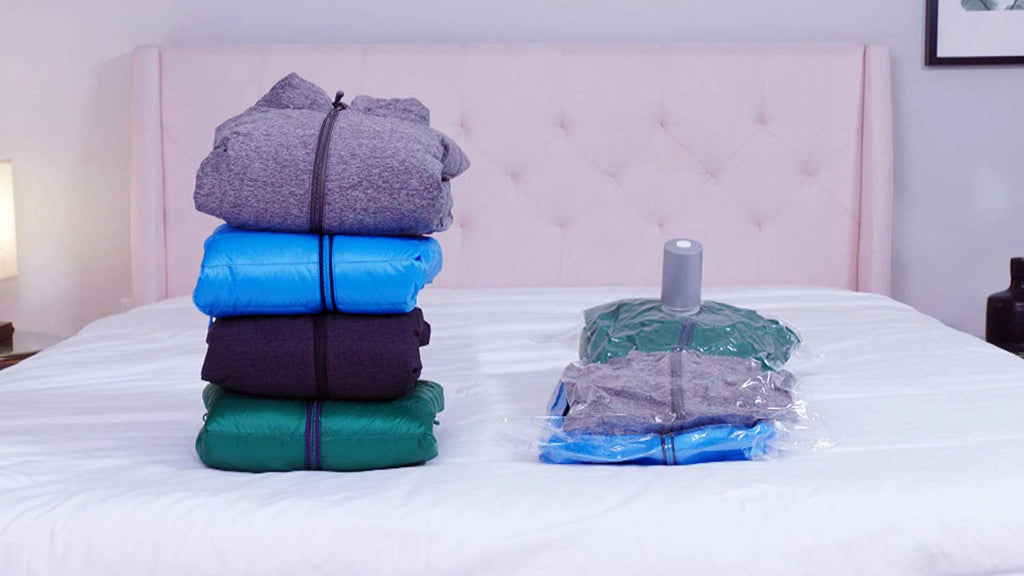 The PAC ‘N STACK is QUICK AND EASY TO USE: and comes with the handheld, travel-size pump and 4 bags. In just three easy steps, you can have instant storage. Simply fill the bag with your valuables, use the clip to seal the bag, and connect the pump for an airtight, vacuum seal. Thanks to PAC ‘N STACK you can store away winter gear or pack for a trip with ease. COMPACT AND PORTABLE: Not only does the PAC ‘N STACK make for more compact storage, but the connected pump is cordless and small enough to stow away in your newly organized storage space. Stop scrambling with messy cords or bulky vacuums and bring the pump with you while traveling or store until needed again. REUSABLE, AIRTIGHT, AND WATERPROOF: PAC ‘N STACK storage bags are reusable, airtight, and waterproof, making them perfect for clothes, towels, blankets, and so much more. Your soft valuables will be safe from leaks and spills that cause dampness and mildew. Get fresh and clean storage with PAC ‘N STACK’s instant storage capabilities. REDUCES VOLUME UP TO 50%: PAC ‘N STACK now makes for endless storage opportunities with added organization. Our vacuum sealed storage bags reduce the volume of your belongings in half. Double your suitcase or closet space and never worry about running out of storage again. GREAT FOR TRAVEL: Whether you carried on or just need more space for your camping gear, PAC ‘N STACK has you covered with its airtight seal and waterproof exterior. PAC ‘N STACK makes packing easy and fun. A cordless pump makes this the best and easiest way to pack and travel. AAA batteries for pump are not included. INCLUDES: 2 Large Bags (17.5x27.5 Inches), 2 Medium Bags (19.5x 23.5 Inches, 1 Vacuum.