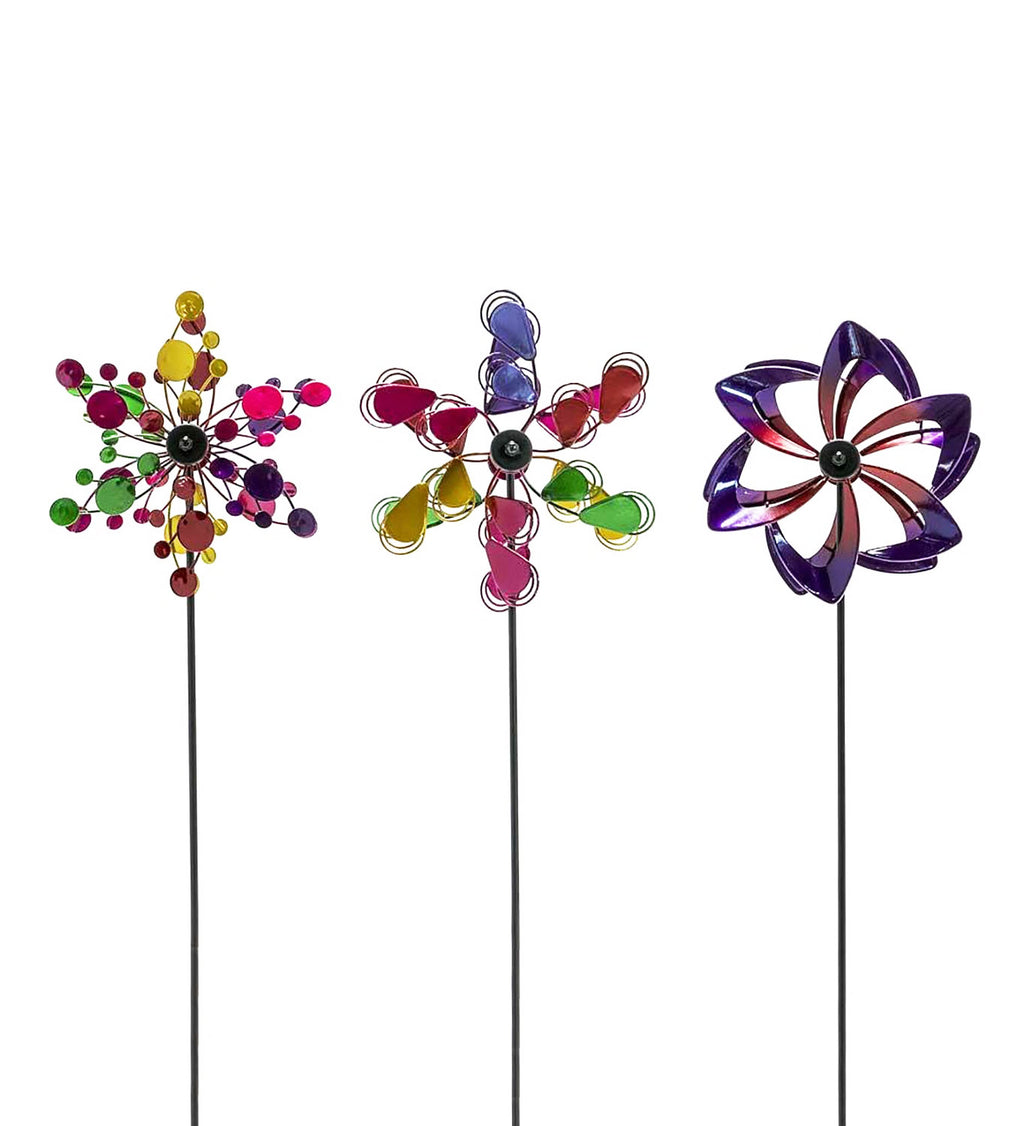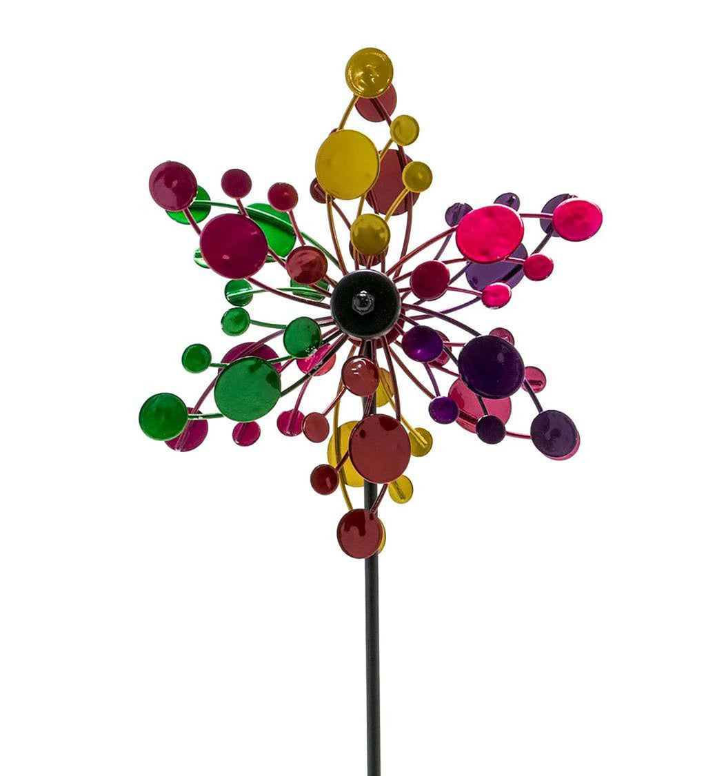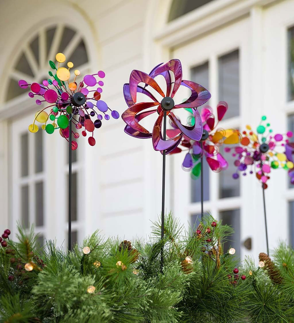 Our miniature Wind Spinners, sold in sets of two, are the perfect accents for smaller spaces from Plow and Hearth. Each iron spinner also comes with a clamp, so it can be staked into the ground or mounted on a deck. These little beauties are smaller replicas of our more popular garden spinners, perfectly downsized to work in planters, on railings or in the garden. Try grouping them in front of shrubs instead of planting annuals; you’ll have color all year long! Spinners spin in the breeze like their larger counterparts. Small replicas of our large wind spinners. Sold as same-style pairs. Includes stake and clamp. Display in the ground or on a deck railing. Made of iron. Painted in beautiful colors. DIMENSIONS: Approximately: 7 dia. x 4¼ D x 22 H Inches.