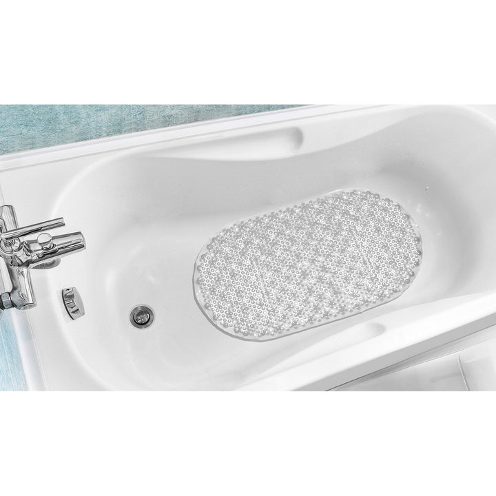 Elevate the look of your bathtub, while adding comfort and security, with the Popular Bath Bubble Vinyl Tub Mat. Features gorgeous bubble design that provides a luxurious feel on your feet while adding a modern touch to any bathroom decor. This durable mat is equipped with multiple powerful suction cups to keep the mat from moving around when applied to clean, non-textured surfaces. There are multiple drainage holes to drain water out quickly and keep the mat dry and clean. Made of durable high quality vinyl. The skid-resistant design provides a more secure shower and bath experience for everyone in your home, children and the elderly. Cleaning is easy, simply machine wash and hang to dry. CARE: Machine wash. MATERIAL: Vinyl. SIZE: 15.5x27 Inches.