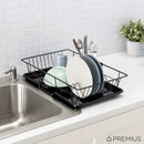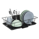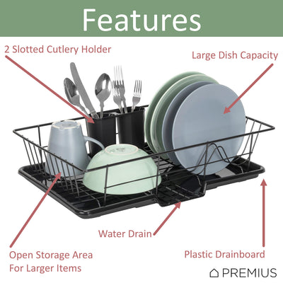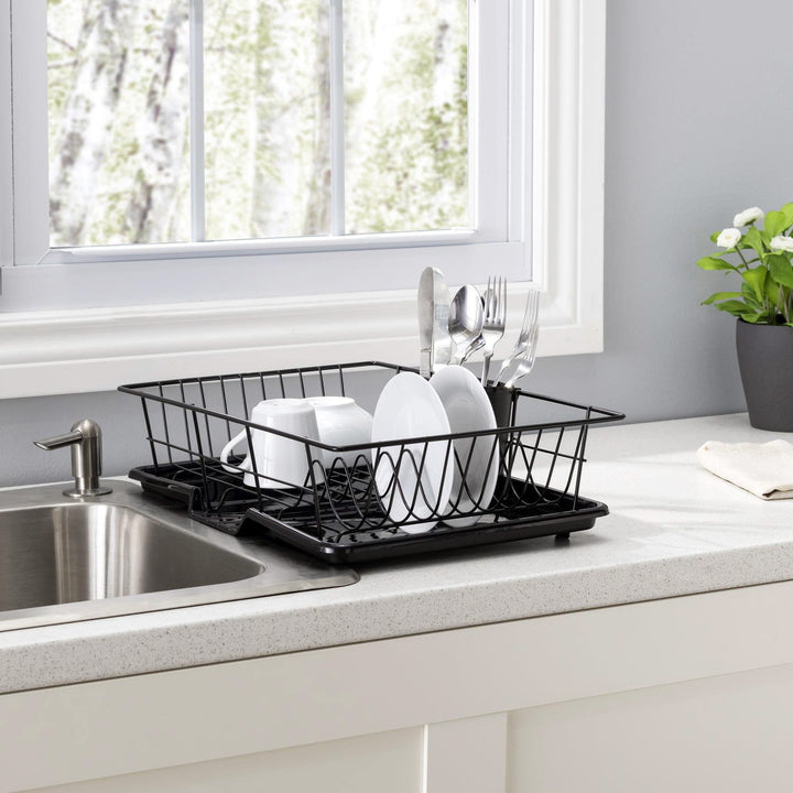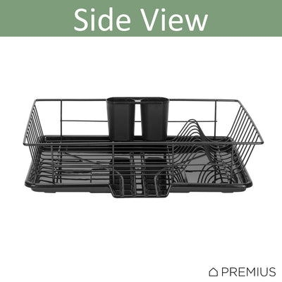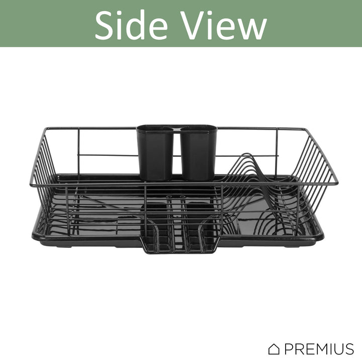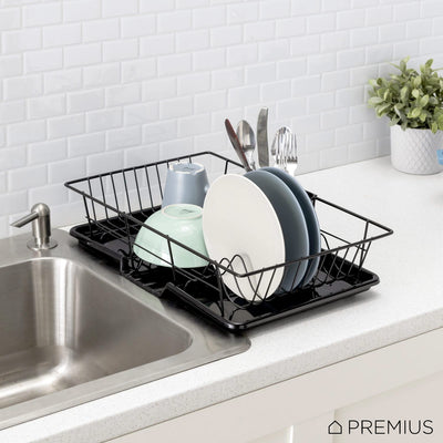 Doing your dishes has never been easier! The Premius 3-Piece dish drainer set is a versatile, sleek and modern dish drainer set that is made from a durable metal construction. This dish drainer offers space for draining and drying after washing. The dish drainer set includes slots for dishes and separate 2-slotted cutlery compartment for easy drying. No need to place a drying mat underneath the rack, this drainer features a removable plastic tray with a lipped edge that directs water into the sink, keeping your counters clean and dry. You can easily slide it out the draining board to clean or use it as a separate drying rack. FITS IN SINK FOR EASY DRYING. COLOR: Black. PRODUCT DIMENSIONS: 19x12x5 Inches.