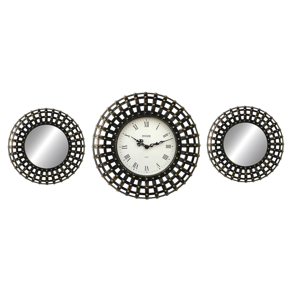 Premius 3 Piece Gladiator Wall Clock with Mirrors will add a cozy and traditional feel to any home. Perfect for your living room or dining room, this 3-piece clock set features a large central clock and 2 smaller accompanying mirrors, all with a studded square pattern. Add a stylish upgrade to your home! COLOR: Bronze. SIZE: 34x14 Inches.