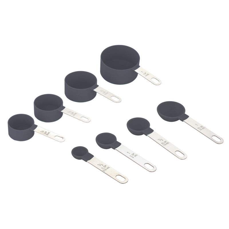 The Measuring Cups are a quick and accurate way to measure ingredients for cooking and baking. This 8-Piece Measuring Cup And Spoon Set will make your cooking easier. This sturdy measuring cup and spoon set is made of stainless steel and plastic, the nesting design allows them to stack neatly together when not in use for convenient storage. The measuring cups give you all the quantities you need for cooking and baking, with whole and fractions of teaspoon, tablespoon and cup measures included. Specially designed with the most commonly called for measurements in mind, it contains all of the essentials for portioning flour, sugar, baking powder and more. And since each piece boasts a nonstick finish that makes food release a breeze, this set will have you itching to create your next baking masterpiece. SIZE: Measuring cups: ¼ cup (59 ml), ⅓ cup (78 ml), ½ cup (118 ml) and 1 cup (236 ml). Measuring Spoons: ½ tsp (2.5 ml), 1 tsp (5 ml) ½ tbsp (7.5 ml) and 1 tbsp (15 ml). COLOR: Black