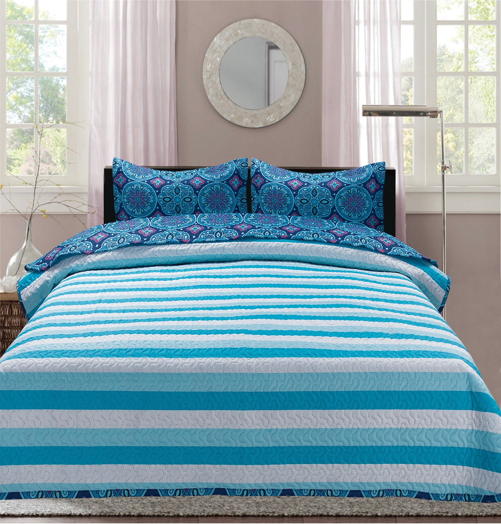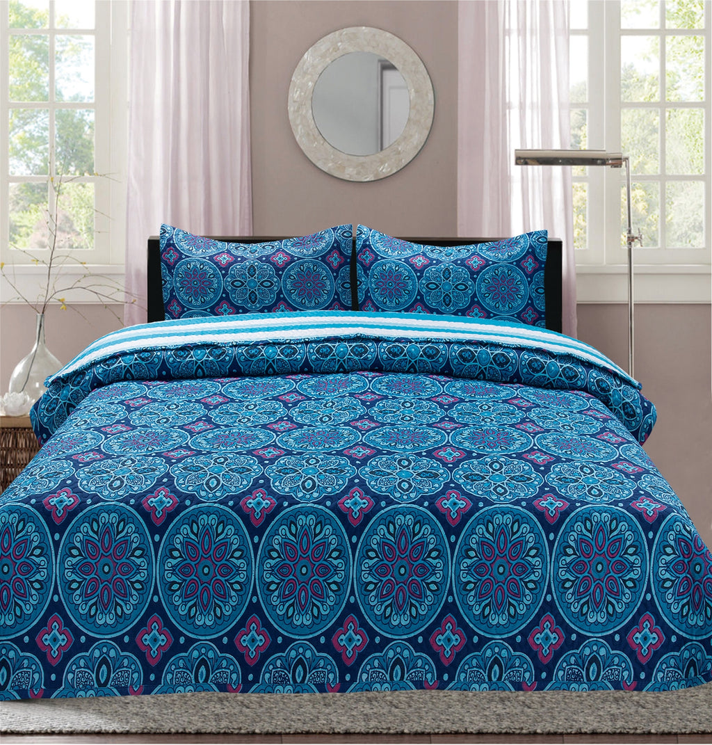 Add a beautiful textured dimension to your bedroom with the Premius Aboriginal Malie Printed Reversible Quilt Set. This quilt set displays an intriguing aboriginal design with floral and morroccan inspirations. The bold color palette makes this quilt set unique as they emanate richness and power with tones of royal purple and deep ocean blue. The quilt set is reversible and features a lighter, simpler striped design in light blue on the other side, giving you the option of changing the look of your bedroom by simply flipping them over when you’re bored. Made of high quality, soft microfiber fabric, this quilt set is ideal for children, adults or anyone looking for a sturdy, comfortable and reliable bed spread. Microfiber fabric is known for its durability and wrinkle resistant properties. Also resists stains and fading. Suitable for all seasons, this quilt set can be used to keep you warm, as a layer over or under your duvet or comforter. Can also be used as a standalone cover for warmer months. Add a new textured dimension to your bedroom with this soft and durable quilt set. With unique stitch patterns on each side, this versatile quilt set is the perfect choice for anyone seeking a bedroom makeover. CARE: Machine wash on a warm gentle cycle with mild soap. Tumble dry on low. Cool touch up iron if desired. MATERIAL: 100% Polyester. COLOR: Purple.