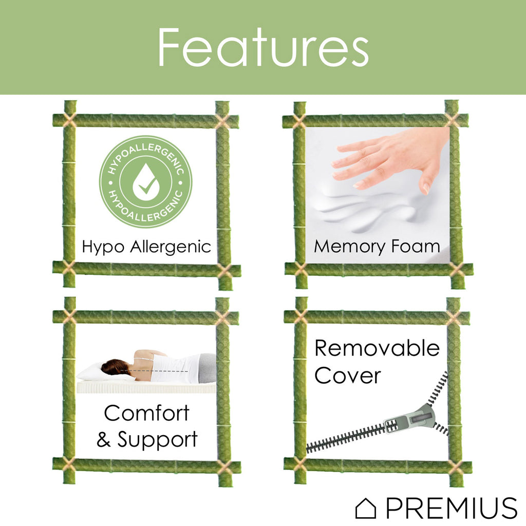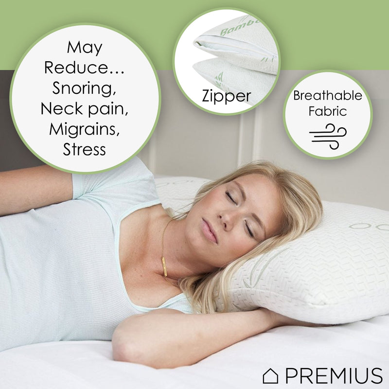 Achieve the restorative sleep you deserve with the Bamboo Memory Foam Pillow by Premius. The super soft and luxurious memory foam will provide comfort and support to your head and neck, conforming gently and reducing pressure points. May reduce snoring, neck pain, migraines and stress. This pillow is sure to keep you cool and comfortable without sacrificing breathability and the hypoallergenic fabric will ensure a comfortable night’s rest without triggering allergies. Now you can dive into the bed of your dreams and catch up on your beauty rest. This super comfortable pillow is unmatched for support, keeping you cool and comfortable, and best of all, you won't have any issues because its hypoallergenic. Features a removable cover for easy cleaning. FOR BEST RESULTS BEFORE FIRST USE: Machine wash, Tumble dry on low setting. DO NOT dry clean. SIZE: Standard-Queen. DIMENSIONS: 18X28 Inches.