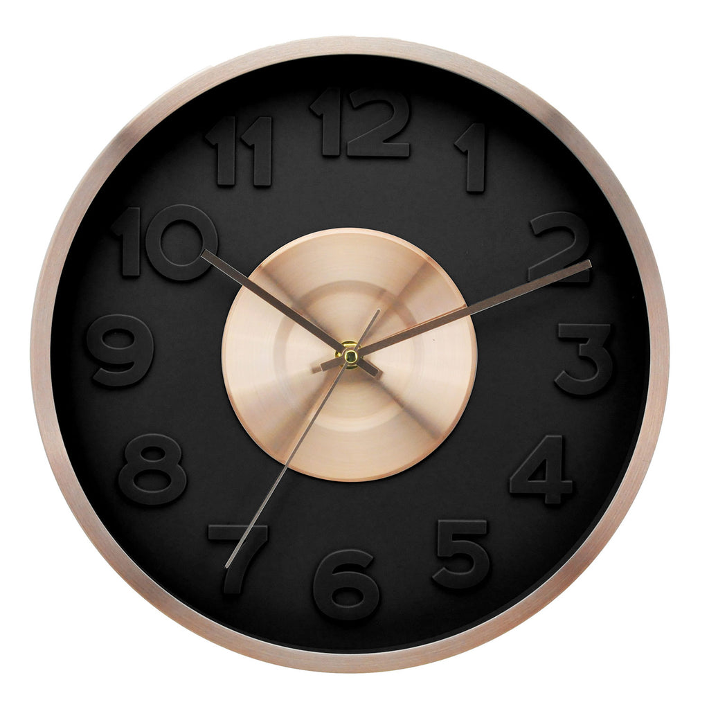 Add a stylish timepiece to any office or home wall surface with this Premius Electro Plated Metal Wall Clock. A simple yet functional piece that can be a great addition to any home. This beautiful round wall clock features a metallic rose gold plastic frame and comes with large black raised numbers on black background with rose gold hands, and a clear plastic front cover. It makes the clock beautiful, stylish and easy to read. It will give you an accurate read on time down to the second so you don't need to second-guess yourself. It works on a single AA battery. Super easy to clean and the clock face is protected from dust and debris. Perfect useful and decorative wall clock for living room, bathroom, bedroom and office wall decor. SIZE: 16 Inches. COLOR: Black-Rose Gold