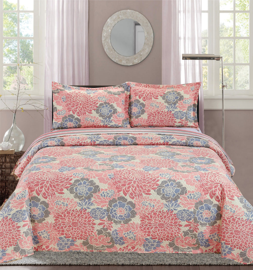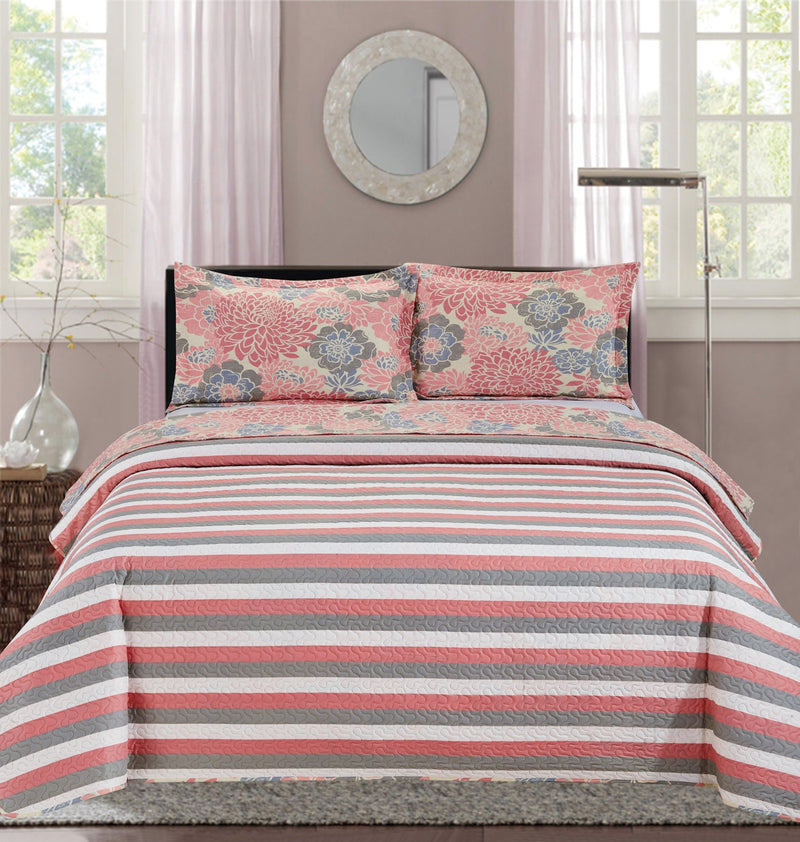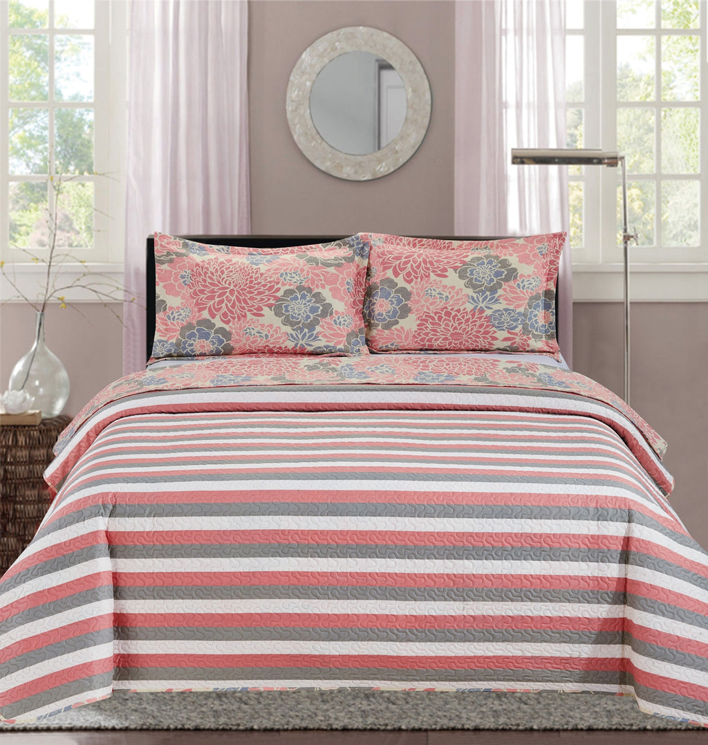 Add a beautiful textured dimension to your bedroom with the Premius Florence Floral Printed Reversible Quilt Set. This quilt set showcases a charming floral pattern with large floral motifs in vibrant shades of blue, gray and pink on one side, and a striped pattern in pink, gray and blue on the reverse side. The quilt set is reversible and gives you the option of changing the look of your bedroom by simply flipping them over. Made of high quality, soft microfiber fabric, this quilt set is ideal for children, adults or anyone looking for a sturdy, comfortable and reliable bed spread. Microfiber fabric is known for its durability and wrinkle resistant properties. Also resists stains and fading. Suitable for all seasons, this quilt set can be used to keep you warm, as a layer over or under your duvet or comforter. Can also be used as a standalone cover for warmer months. Add a new textured dimension to your bedroom with this soft and durable quilt set. With unique stitch patterns on each side, this versatile quilt set is the perfect choice for anyone seeking a bedroom makeover. CARE: Machine wash on a warm gentle cycle with mild soap. Tumble dry on low. Cool touch up iron if desired. MATERIAL: 100% Polyester. COLOR: Gray.