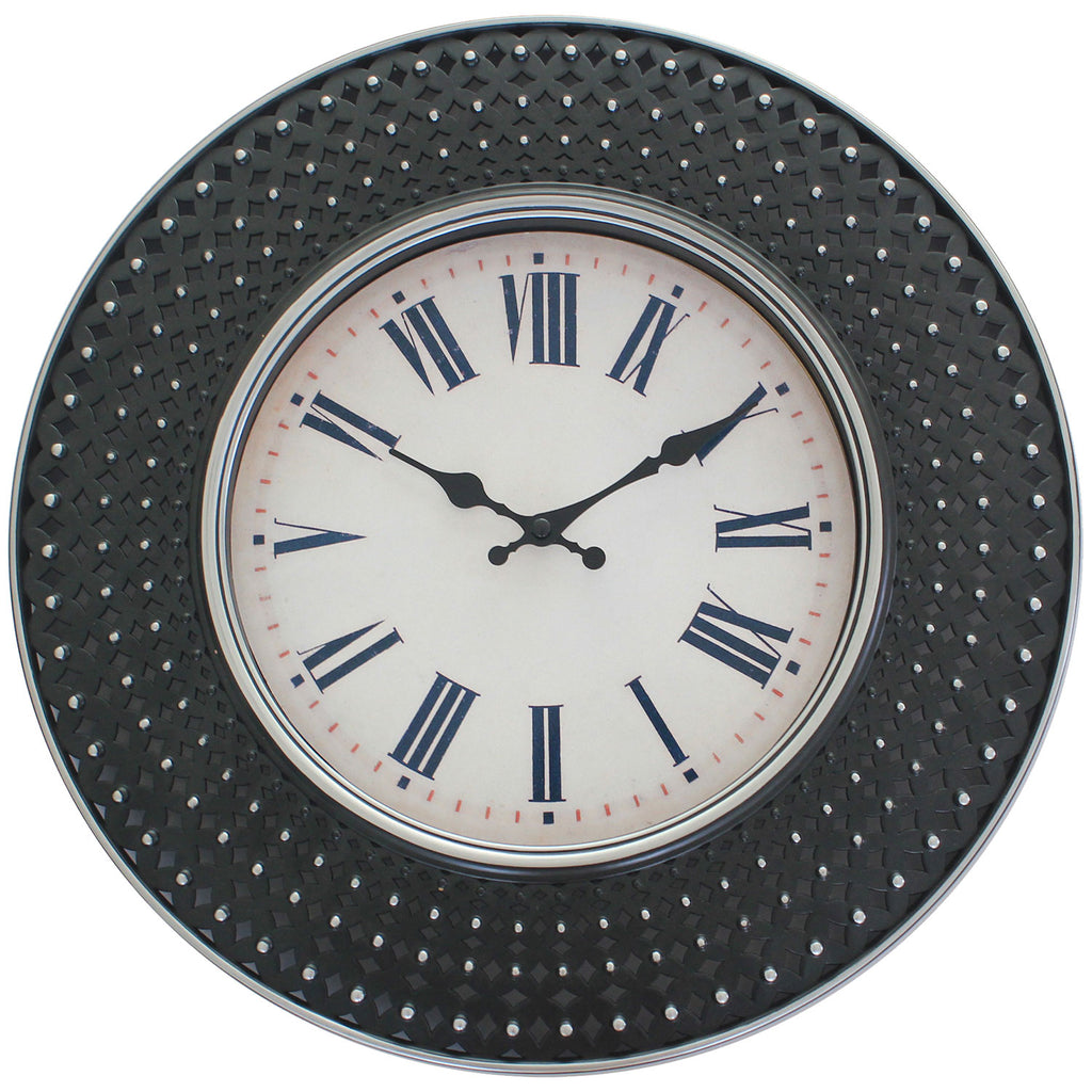 Make a statement on your wall with Premius Large Decorative Beaded Wall Clock and display a work of art that matches, or brings together, your decor in any room. Features a beaded embellishment surrounding the clock face. The black colored frame is finished with silver beaded accents with black hands and roman numerals. Perfect clock to dress up a wall in your kitchen, living room, bedroom, bathroom, family room, den, office or any other living space. The clock works on a single AA battery (Not Included), and is easily hung on any wall. Sturdy construction keeps dust outside of the clock where it belongs and can be easily cleaned. SIZE: 16 Inches. COLOR: Black with silver beads.