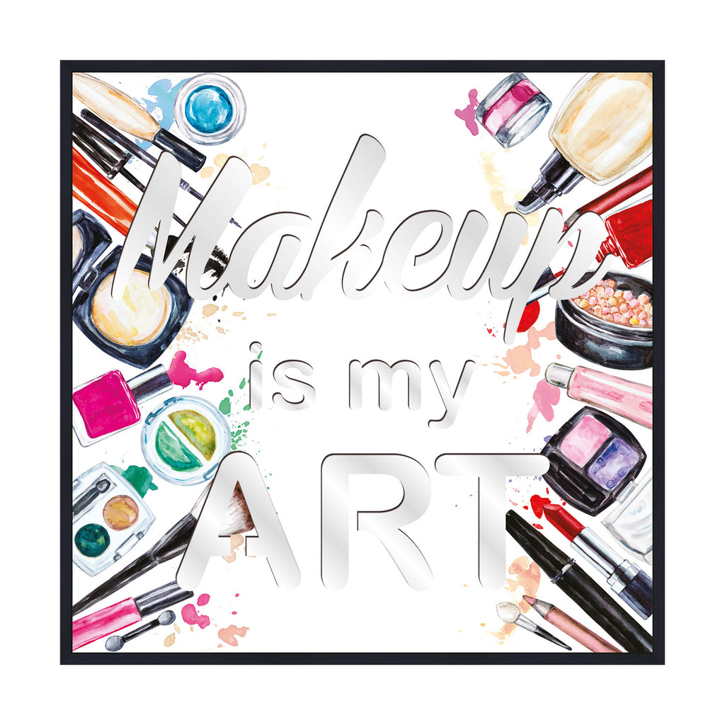 Add a chic finishing touch to your home with the Premius Makeup Is My Art Wall Art With Mirror Cut-Outs. Features hand drawn makeup cosmetics such as powder, eye shadow, brush lipstick, etc and the word “Makeup Is My Art” designed with mirror cut-outs, with a black frame around it. Hang it in your bathroom or by your vanity to inspire your next great look. This beautiful wall art makes a great addition to your makeup room decor, girl’s room, beauty salon, bathroom decor or as a gift for a makeup artist or friend who loves makeup and more! SIZE: 12x12 Inches. COLOR: Multi