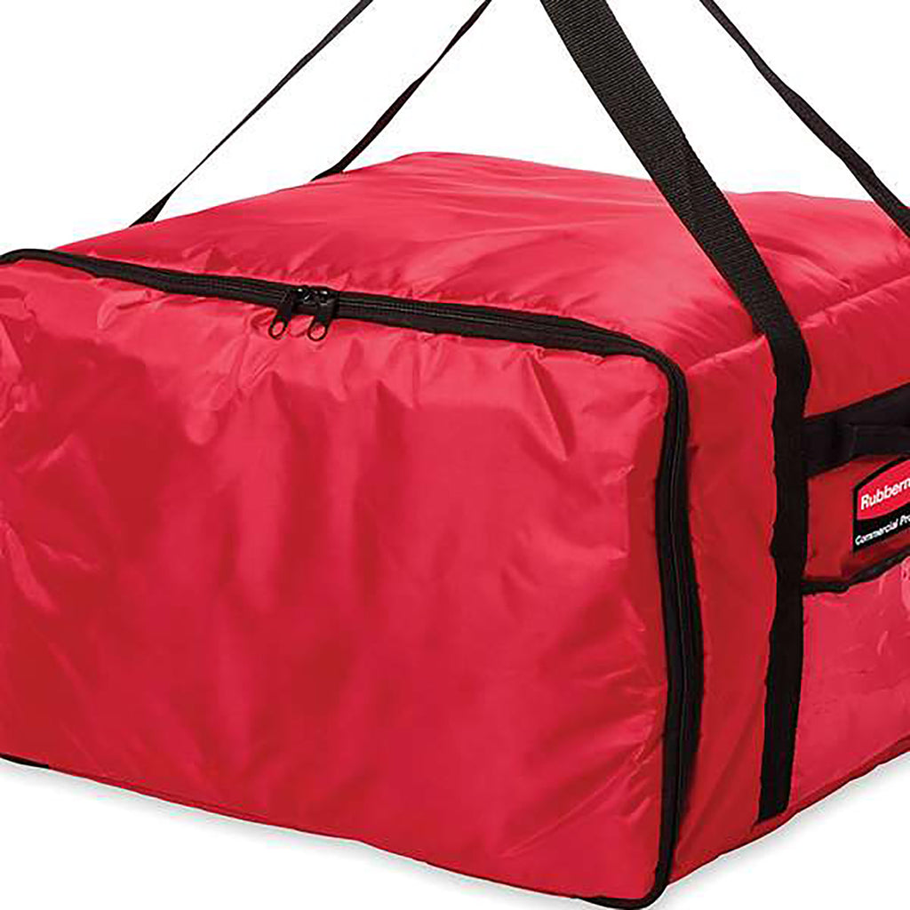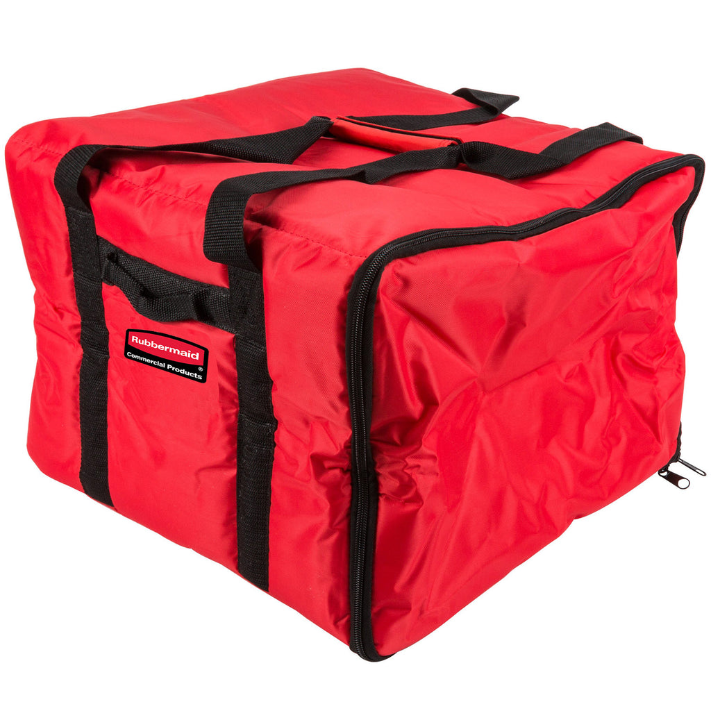 This Rubbermaid Commercial Insulated Pizza and Food Delivery Bag is perfect for delivery, outdoor gatherings, or transportation to catered events. Designed for professionals. Two inches of polyester insulation offers maximum thermal retention and no moisture or odor retention. Large identification window allows for easy labeling of orders, dates and temperatures. All bags are commercial dishwasher safe. Hanging loop provides easy storage and proper drying. Commercial-grade nylon exterior will not deteriorate with use and offers years of performance. Commercial-grade zippers and closures protect food from heat loss. COLOR: Red. SIZE: 17x17x13 Inches.