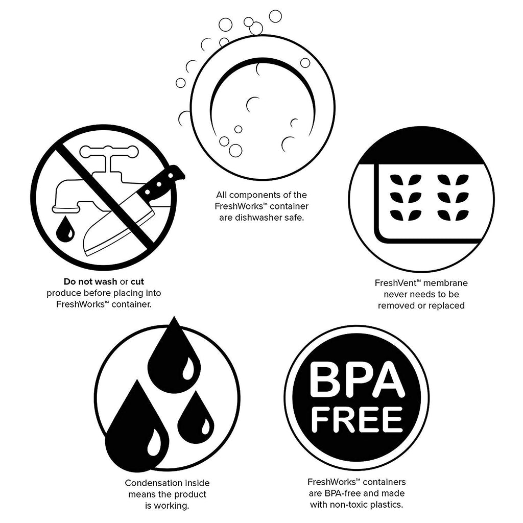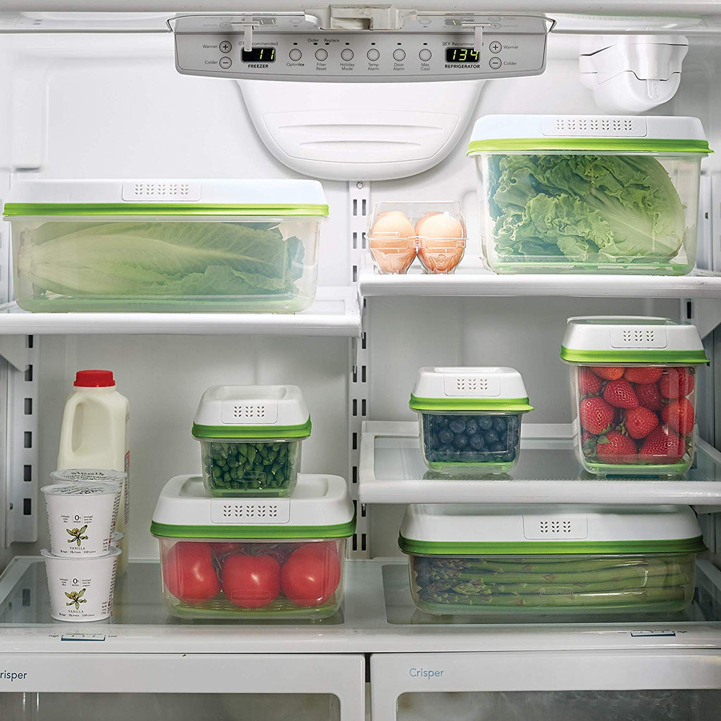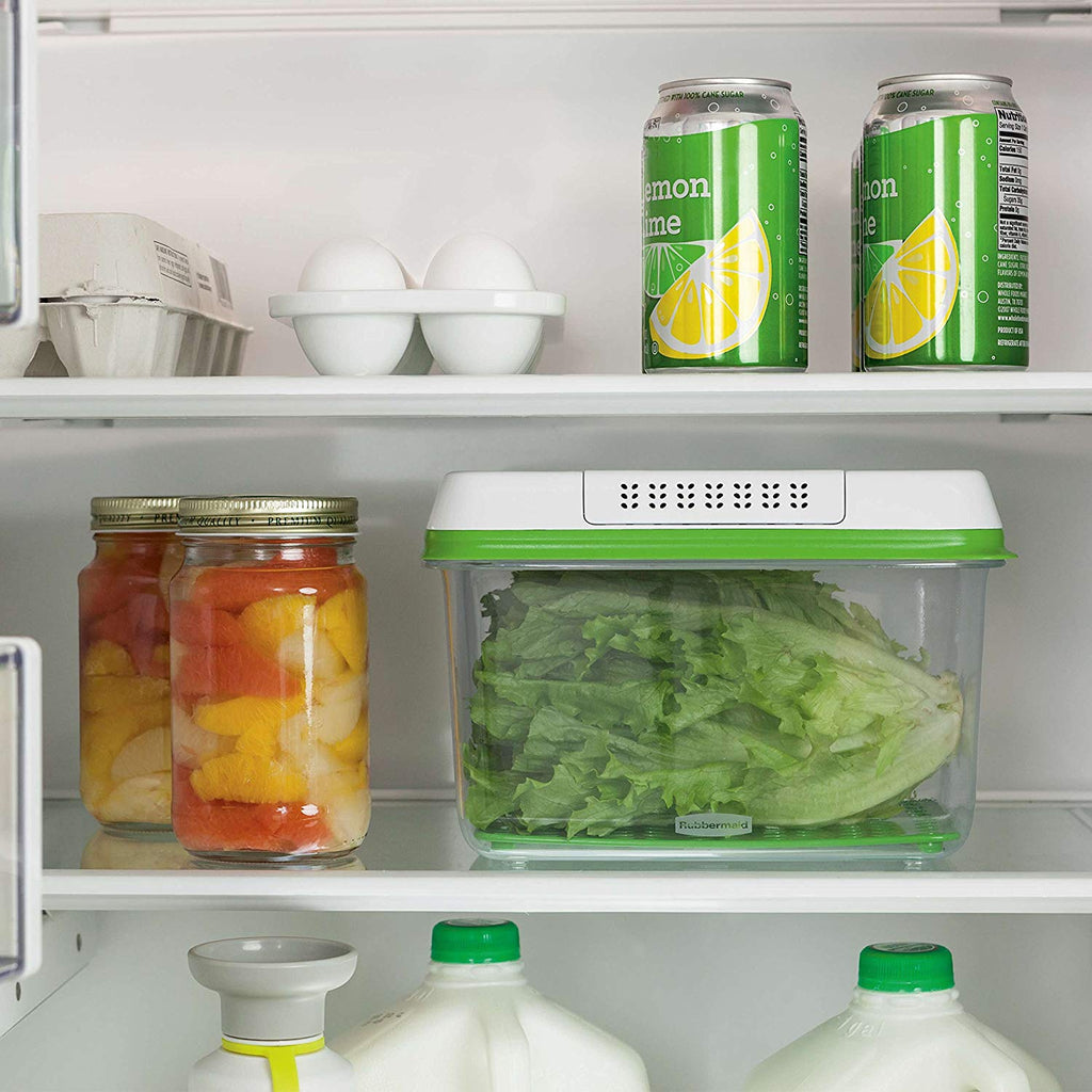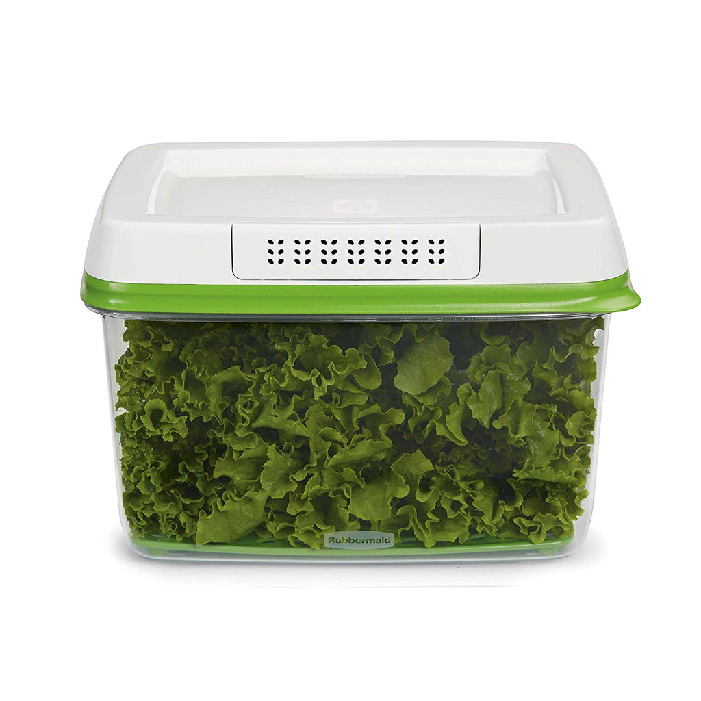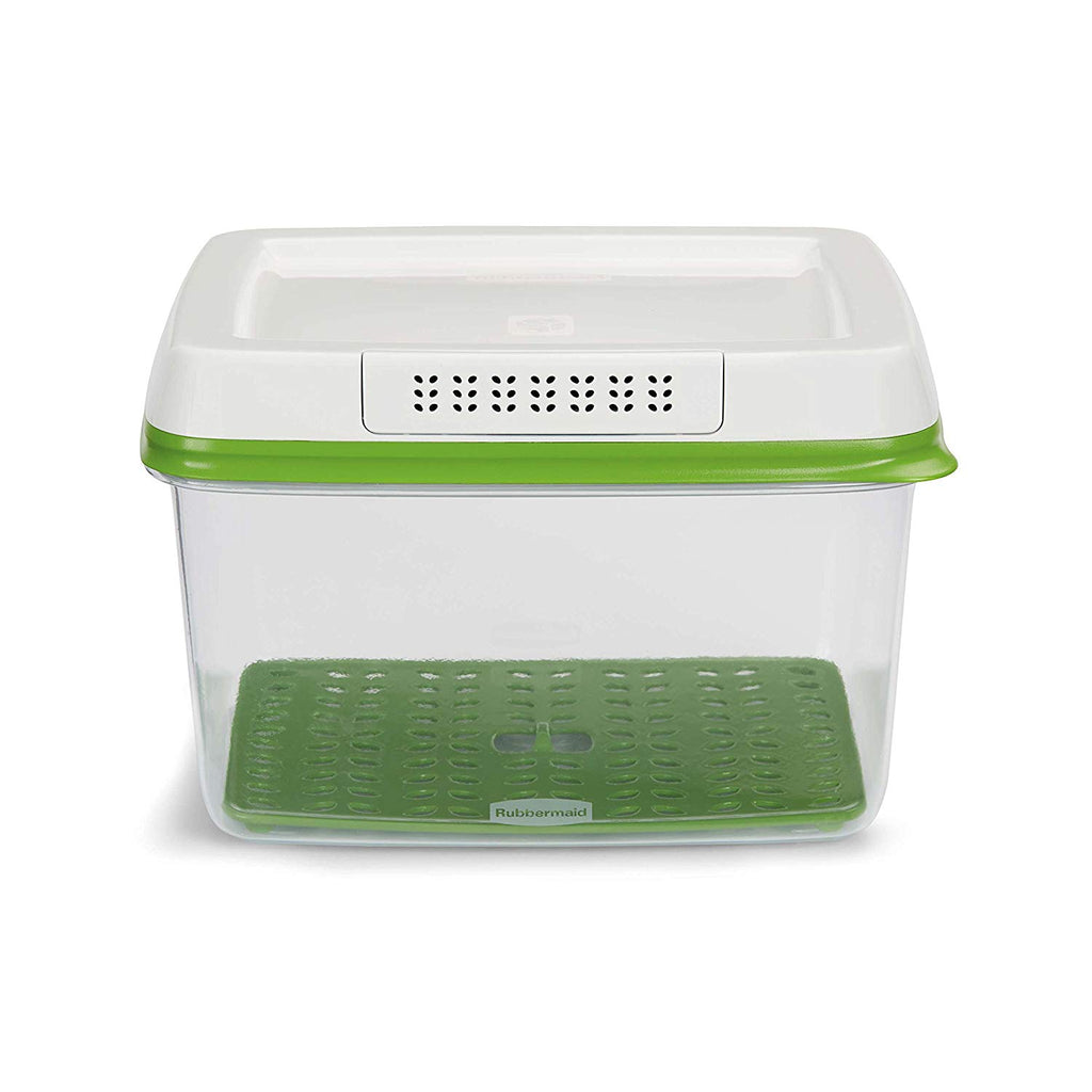 Keep produce fresher longer with the Rubbermaid FreshWorks 17.3 Cup Produce Saver. Revolutionary FreshVent technology creates an optimal environment for fruits and vegetables by regulating the flow of oxygen and carbon dioxide in and out of the produce container. The CrispTray at the bottom of the food container elevates produce away from moisture and promotes airflow to help prevent spoilage. The built-in lid filter never needs to be replaced and will last a lifetime. Longer lasting produce means fewer trips to the grocery store. CAPACITY: 17.3-Cup. DIMENSIONS: 9.4 x 7.3 x 6.3 Inches. COLOR: Clear, Green, White.