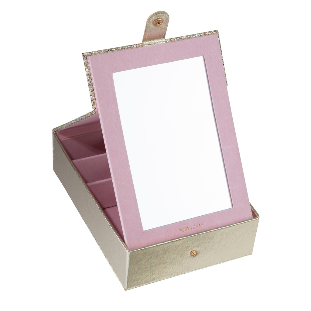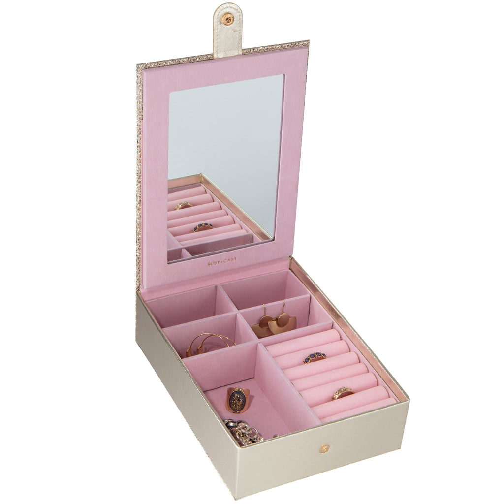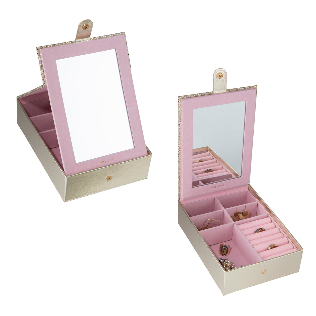 The perfect addition to any bedroom or bathroom, the Ruby+Cash mullti compartment jewelry organizer with vanity mirror. Organize all your jewelry in one box that contains 5 compartments and 8 section ring organizer. An adjustable built in large mirror built into the box, flips open t the perfect angle to do your makeup and put your jewelry on. The snap front closure ensures the box stays close keeping all your jewelry and accessories in the box. A great addition to any vanity, dresser and dorm room!