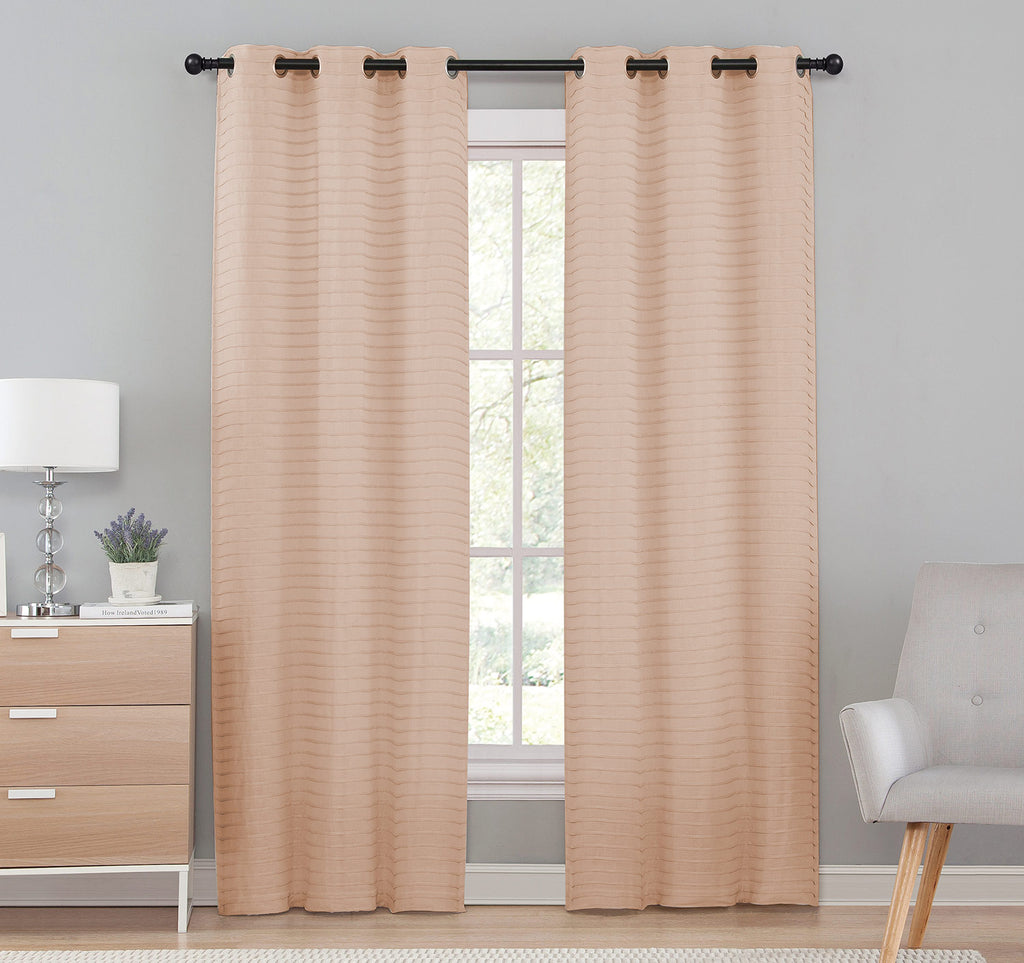 Give your windows a stylish upgrade with the Sag Harbor Sheer Panel Pair. This panel pair is perfect for giving your home that modern accent and is ideal for any bedroom, dining room, living room or den. It features a horizontal raised striped design on a sheer front in a solid taupe color. The stylish grommets will make hanging a breeze! Just slide any curtain rod through and add that elegant touch to any setting. Made of 100% polyester, these panels are very durable as well as wrinkle and shrink resistant. Polyester fiber is breathable, has excellent value, and is also machine washable to save time and energy. COLOR: Taupe. DIMENSIONS: 55x84 Inches.