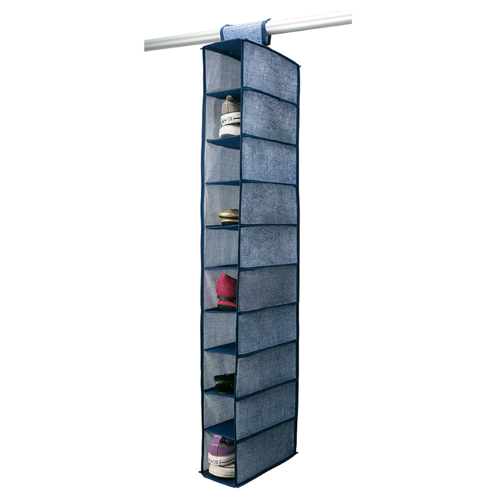 Free up floor space and double your storage space with the Simplify 10-Shelf Hanging Closet Organizer. This collapsible closet organizer saves space and helps keep a closet organized. Perfect for purses, shoes, and other accessories you will declutter your area. Hang in your bedroom closet, over a door or bathroom and have everyone taking second glances at your stylish new organizer. Effortlessly blending with existing decor to give your decor a modern update. It’s breathable, non-woven material attaches securely to closet rod with velcro fasteners. Instantly declutter your space, and organize your closet with the Simplify 10-Shelf Hanging Closet Organizer. COLOR: Denim Colors may vary. DIMENSIONS: 6x12x47 Inches