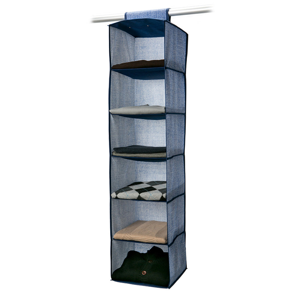 Free up floor space and double your storage space with the Simplify 6-Shelf Hanging Closet Organizer. This collapsible closet organizer saves space and helps keep a closet organized. Perfect for purses, shoes, belts and other accessories reclaim storage space from behind your door. It’s breathable, non-woven material attaches securely to closet rod with velcro fasteners. Hang in your bedroom closet, over a door or bathroom and have everyone taking second glances at your stylish new organizer. Effortlessly blending with existing decor to give your decor a modern update. Instantly declutter your space, and organize your closet with the Simplify 10-Shelf Hanging Closet Organizer. COLOR: Denim Colors may vary. DIMENSIONS:12x12x47 Inches