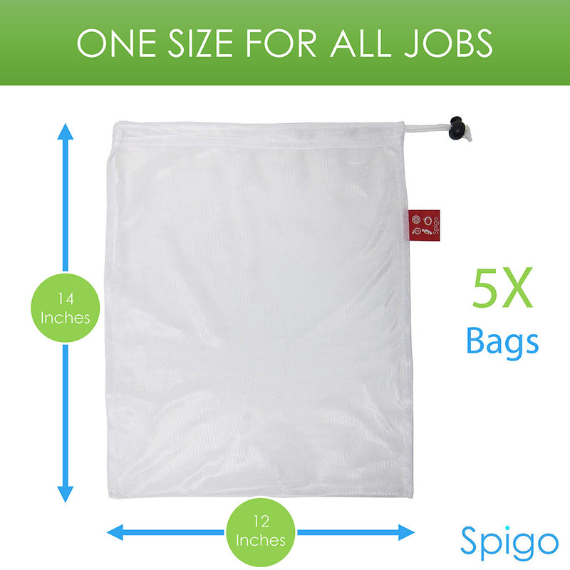 Spigo’s Reusable and Washable Mesh Produce Bags are strong, light weight and the perfect solution for rotting fruits and vegetables as well as the excessive wasting of plastic bags. Spigo’s high quality produce bags allow your food to breath. Putting your produce in those plastic bags from the store cut off an air source which causes your food to rot and waste. Go plastic free! Helping the environment and prolonging the freshness of your goods! The eco-friendly reusable mesh produce bags are made of the best 100% polyester fibers strong enough to hold a wide range of items, fruits or veggies. These bags are also see-through so you can easily find whatever you are searching for. Better yet, each bag is color coded with a nifty Spigo produce logo to better coordinate and locate your food. Cleaning is super easy, just wash them in cold water and then hang them to dry! Spigo’s Produce Bags feature a drawstring closure to secure a safe trip home. The versatility, eco-friendly, high quality and convenient construction was designed with you in mind! Time was put into the creation of this product so you and your loved ones could enjoy a new home product that will improve your standard of day-to-day living. Package Contains: 5 Produce Bags. Tare weight: Each bag weighs 0.4 ounces. Size: 12x14 Inches.