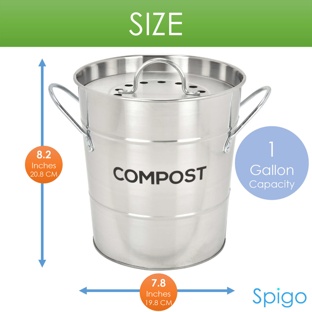 Spigo Steel Kitchen Compost Bin With Vented Charcoal Filter and Bucket, Satin Silver, 1 Gallon