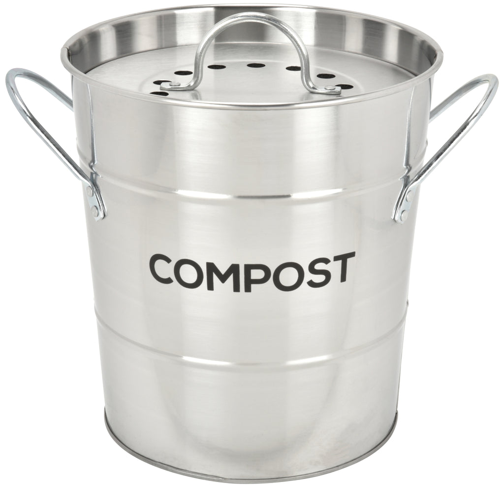 Meet a stylish environmental solution for recycling your kitchen waste and stop throwing away food scraps in the garbage! This compost bin is designed to be attractive enough to keep front and center on your countertop. The Compost Bin is used to store food scraps until they can be transferred to an outdoor composter. Its sturdy handles makes it easy to carry the compost bin outside and its removable lid to keep emptying simply. This isn’t your ordinary compost bin, it features, a removable and replaceable plastic bucket inside for easy cleanings, a lid with charcoal filter which absorbs and contains unpleasant odors making this a perfect addition to your kitchen. This compost bin can store more than fruit and vegetable peelings you can also use it for tea leaves, flowers and coffee grounds, even eggshells. After you’ve composted all your kitchen materials you can transfer the organic material to your outside compost bin and later return the nutrients back to the earth's soil. It’s attractive retro design with stainless steel finish complements most decor while still providing durability, so that this can last as your favorite compost bin for a very long time. This compost bin gives you the option to store it on your kitchen counter or inside your cabinet. Transfer your food scraps in style! The retro vintage design has a clean yet timeless design. Made with Stainless steel exterior and plastic basket inside. The compact size and small footprint is meant not to take too much counter space. The Charcoal filter is easily replaceable, Measures: 5.25 Inches Diameter. COLOR: Satin Silver. BUCKET CAPACITY: 1 Gallon, 4 Quarts, or 16 Cups. MEASUREMENTS WITHOUT HANDLES: 8.2x7.8 Inches, WITH HANDLES: 9.5x10 Inches.