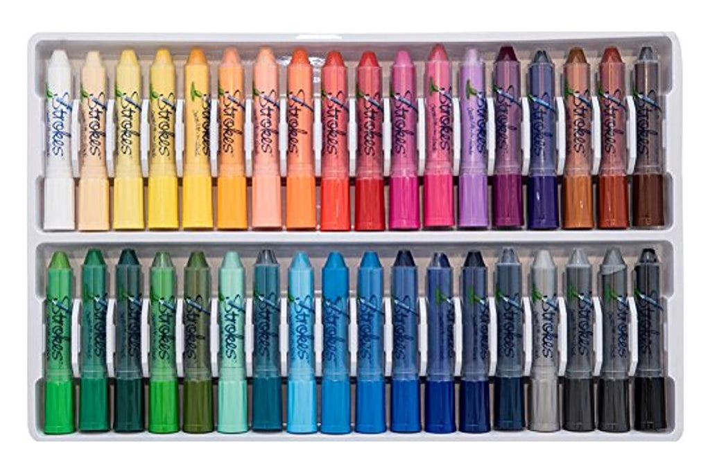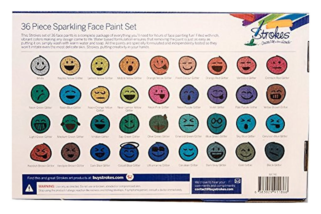 Bring life to the party with the Strokes 36-Piece Sparkling Face Paint Set. Whether you’re in attendance of a birthday party, stage performance, costume party, festival, baby shower or just want a temporary tattoo, the Strokes 36-Piece Sparkling Face Paint Set will deliver bright, colorful results that it’ll look like a professional’s work or art! With a wide variety of 36 vibrant, glitter colors to choose from, your options will be endless! Colors range from “crimson red glitter” to “neon lemon yellow glitter”, “emerald green glitter” and even “cobalt blue glitter”. Animals, flowers, superheroes, Go for it, make any design come to life! Broad tips promote safe use for kids of all ages. Unlike markers, this is a great no-mess face coloring for children and adults, professional face painters or beginners. These sticks are bigger than most face paint crayon pencil sets, and the ergonomic design provides the perfect combination between balance and comfort, to deliver consistent paint strokes. A good-grip, non-slip fit for children's hands. A complete package of everything that you will need for hours of face painting fun. The water-based formulation ensures that removing the paint is just as easy as putting it on, simply wash with warm water and soap. All the paints are specifically formulated and individually tested so they won’t irritate even the most delicate skin. Strokes, putting creativity in your hands. CONTENTS: 36 Pieces.