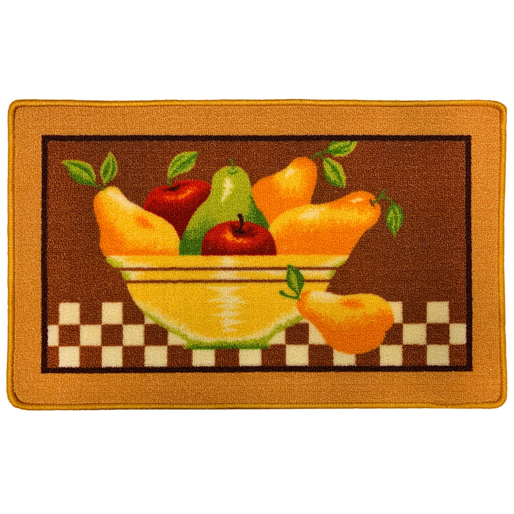 Decorate your kitchen and add a fresh accent with the Sweet Pear Printed Kitchen Rug. Vibrant colors and delightful details make this kitchen rug a beautiful addition to your kitchen’s decor. With colorful pears and apples in an eye catching, sunshine yellow bowl, the bright colors of this kitchen rug will add a colorful pop and an inviting atmosphere to any kitchen! What an eye catching piece for a kitchen! The skid resistant backing provides safety for both children and adults by keeping the rug in place and preventing slips. This kitchen mat will liven up your kitchen and the soft, sturdy material will add some comfort as you toil away cleaning dishes, preparing vegetables, cooking and maybe even brewing a cup of coffee. When it comes to care for your new kitchen rug, you can save time by placing it in the washing machine on a warm cycle. You can also hand wash. DO NOT bleach or dry clean. Dry in shade. COLOR: Yellow. DIMENSIONS: 18x30 Inches.