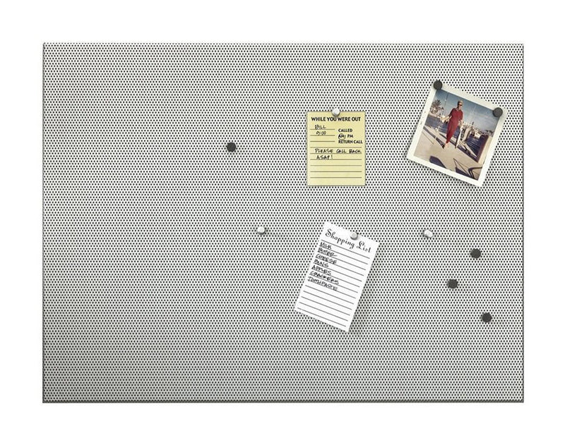 The Umbra Nickel Metal Bulletin Board will keep you organized! This wall mount bulletin board has a stylish powder-coated steel cover exterior with small perforations and a soft cork material inside; cleverly designed so it works equally well with push pins or magnets, creating the all-in-one message tasks and message solution! Use this handy organizer in your office, dorm room or in the kitchen to remind you of daily tasks or to post important information for all to see. The nickel finish will complement almost decor. Memos, notes, photos, calendars and more! The board can be hung either vertically or horizontally and its modern style adds a sleek touch to any space. Stay organized, keep your favorite photos for display, and never miss a deadline.