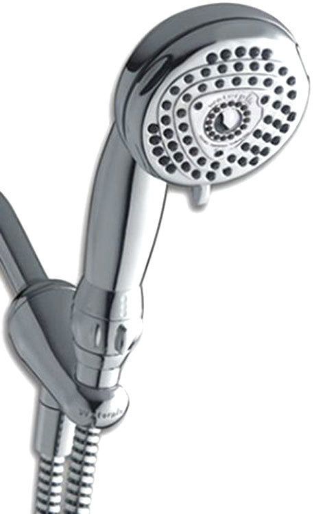 WaterPiK latest innovation in eco-friendly technology reduces water consumption and energy use. The Eco Flow handheld showerhead offers stylish design with five spray settings plus, it has a water-pause toggle to help you maximize savings. This shower-head's spray modes include a full body coverage spray, concentrated fan spray, misting spray, circular massage, misting combination, and a circular massage setting. With Waterpik Advanced OptiFLOW Technology, you will have a high quality shower experience through an efficient use of water. The showerhead comes with a shower-arm attachment and a 5 foot long hose. Color: Chrome.