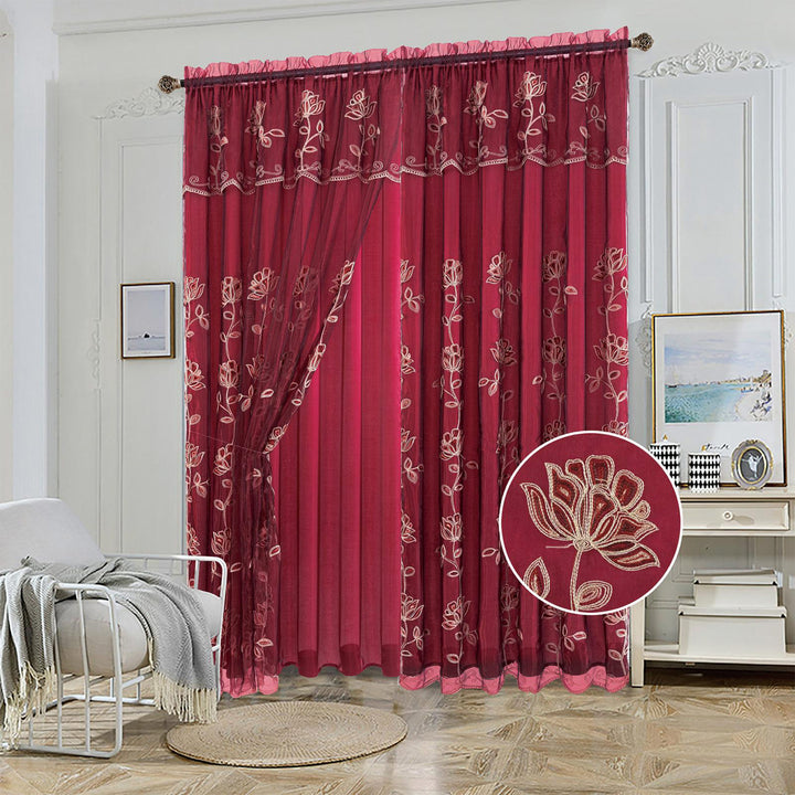 Yasmin Embroidered Window Curtain Panel with Attached Valance and Backing, 54x84 Inches